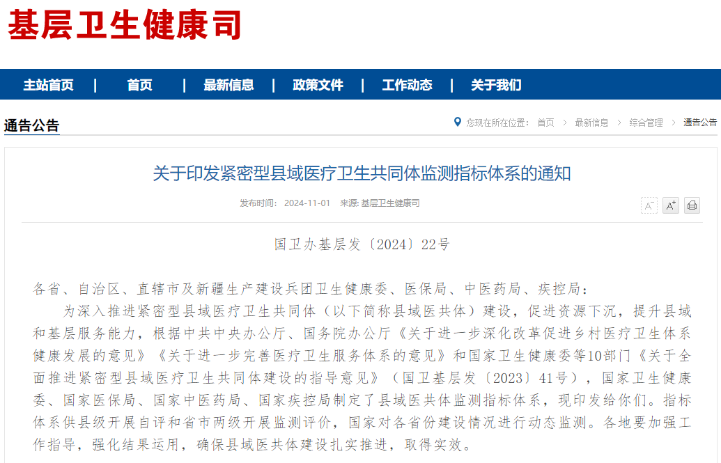 近日,國家衛(wèi)生健康委辦公廳、國家醫(yī)保局辦公室、國家中醫(yī)藥局綜合司、國家疾控局綜合司聯(lián)合印發(fā)了《關(guān)于印發(fā)緊密型縣域醫(yī)療衛(wèi)生共同體監(jiān)測指標(biāo)體系的通知》。